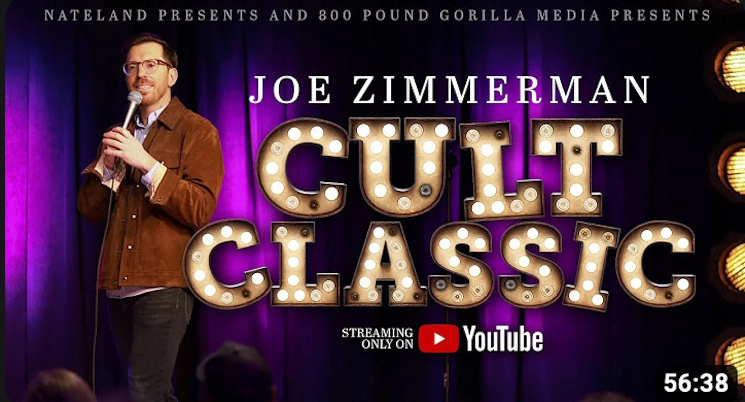 Hola! It’s me, Joe Zimmerman. Writing to let you know my new one hour special, “Cult Classic” is out now on YouTube! Everyone’s talking about it, and we’re all very excited over here at headquarters. In fact, my Mom watched and immediately called to let me know she liked my haircut. Which was huge.